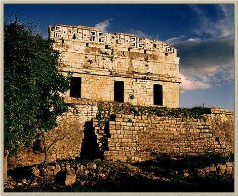 La blanca piedra del edificio conocido como Chichan Chob (Casa Colorada) es teñida de dorado por el sol del crepúsculo. Este edificio debe su sobrenombre moderno al hecho de que, cuando fue descubierto, aún tenía vestigios de pintura roja.