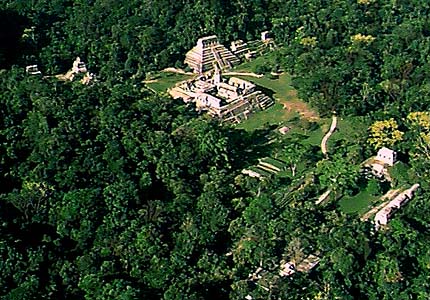 | Vista de la porción central de la ciudad desde el noreste. Diagonalmente, desde la parte superior izquierda hacia la parte inferior derecha, se encuentran: el Grupo de la Cruz, el Palacio y el Templo de las Inscripciones, la cancha del Juego de Pelota (al centro, a la derecha) y el Grupo Norte (con la prominente fachada del Templo del Conde). (Fotografía: Merle Greene Robertson.) |