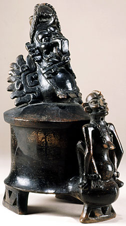 Lidded Vessel with Principal Bird Deity and Figure. Tomb 2, Structure IV-B, Calakmul, Campeche, Mexico. AD 500-560. Ceramic. 30 x 13.5 cm. CNCA-INAH, Museo Histórico Fuerte San Miguel, Baluarte de San Miguel, Campeche, Mexico. Achaeologist Ramón Carrasco, who excavated Calakmul's Structure IV, describes it as a place for rituals invoking the ancestors and supernatural beings. Its central building is spanned by a carved stone lintel portraying the king as the Maize God dancing at (or out of) the witz mountain. The structure was sanctified by many ritual caches that included human sacrifices and symbolic groupings of stones and shells. In Structure IV-B Carrasco discovered a tomb thought to be that of the king Tuun K'ab' Hix, who died sometime before AD 560. He was a powerful regent who extended Calakmul's influence far into Quintana Roo and the Peten lowlands, even presiding over the accession of Naranjo's king Aj Wosal in AD 546.