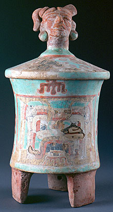 | Stucco was applied over the original carved-incised and slip-painted surfaces of the pair of lidded tripod vessels below. the post-fire painted imagery, which depicts a feathered feline devouring a human heart, recalls Teotihuacan iconography, while the curvilinear image style, human portrait head knobs, and profile saurian heads on the lids are all from Maya artistic canons. In addition, the chemical composition of the paste on both vessels is nearly identical to that of ceramics produced at Quirigua. |