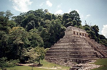 Los impresionantes restos del Templo XXVI y otras estructuras ocultas en la ladera por encima del Templo de las Inscripciones (a la derecha). Actualmente cubierto por la selva, fue éste un complejo completamente construido.
