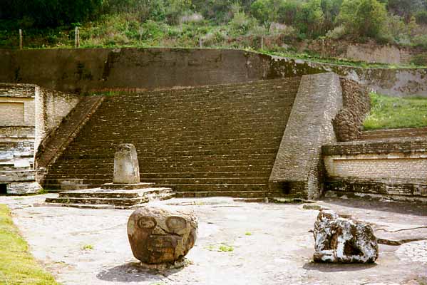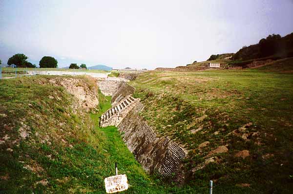 The Great Pyramid appears like a natural hill in the center of the now university town of Cholula, Puebla. The largest pyramid in America by volume, this platform contains many layers of construction that span nearly ten centuries. Archaeologists have tunneled approximately five miles of corridors within the pyramid. One such archaeological tunnel is accessible to tourists, and visible in the photo at the top of this page. At the base of the thumbnail photo to the left, one can see Structure A and the "Courtyard of the Altars". |
