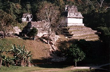 | View of our Temple XIV operations from the Palace. Our excavations, revealing previously unknown levels of the Cross Group plaza, can be seen partway up the hill behind the tree. Temple XIV is also behind the tree. Beyond it is the Temple of the Foliated Cross, and on the right is the Temple of the Sun. |