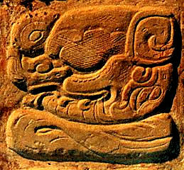 | "At Copan on Altar G1, this serpent head refers to the vision serpent. I suspect that it is here because the particular [rite] in which Kan-Xul participated involved bloodletting" (Schele, 1988). |
