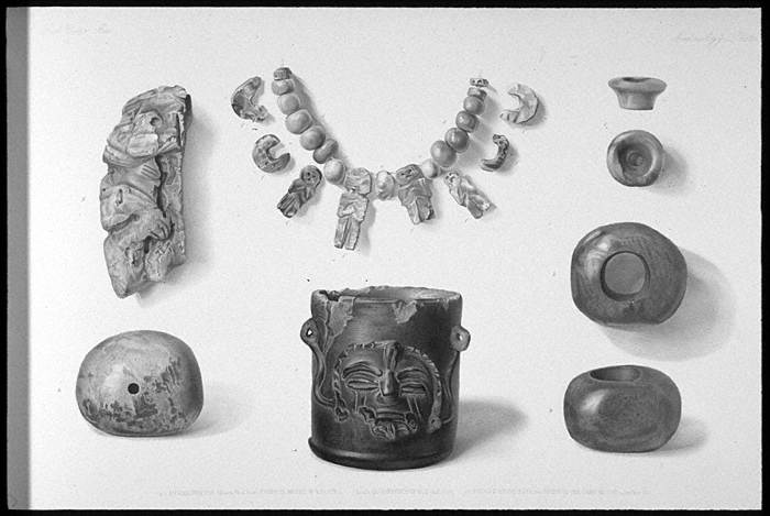 (a) AN EARTHEN POT (drawn 2/3 of size FOUND IN MOUND No.4, Plate 1. (b,c,d,e,f,g,) CONTENTS OF POT (full size) (h) PIERCED STONE (full size) FOUND IN THE SAME MOUND See Page 20.
