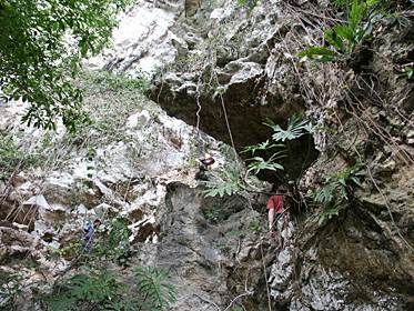 | The final ascent to the cave where the wooden box was found at Alvaro Obregon. The cave itself could not be entered because of a recent rock fall. As explained by trail guide Guadalupe Cruz Guttierez, "The dueño does not wish it." (Photo: Joel Skidmore) |
