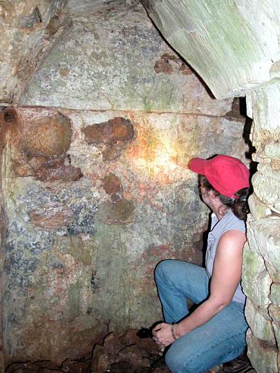 Ann Stuart viewing mural remnants within vaulted chamber.