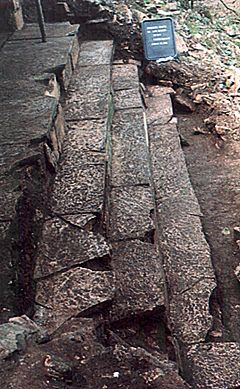 The uppermost steps of Temple XIX are constructed in a manner virtually identical to the northern stairs of Temple XXI. The treads and risers of these steps are faced with thin limestone slabs carefully cut and fit together with a thin layer of stucco mortar at the joins. (Photo: Alfonso Morales.) |