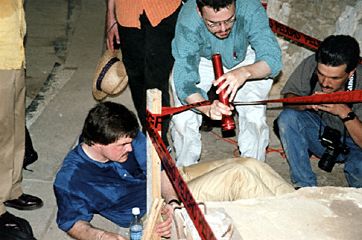 Nikolai Grube, Simon Martin and Jorge Perez de Lara ponder the inscriptions.
