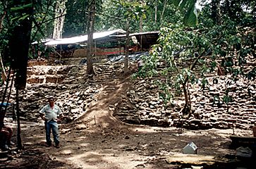 The Temple XIX mound in the early stages of consolidation. Principal Investigator Alfonso Morales in the foreground.