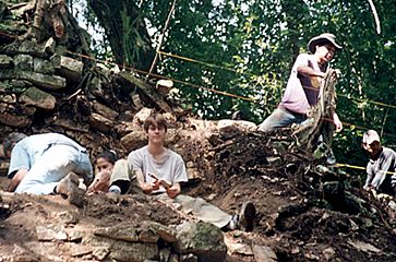 Christopher Powell (back to camera), George St. Clair (center) and Rafael Gallegos Hernandez (in cowboy hat) at work on the west side of the Temple XIX mound.