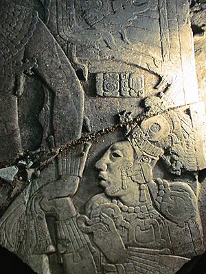 Large fragments of the limestone tablet from in front of the bench in Temple XIX, showing a Maya lord.