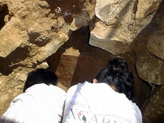 Restoration experts Alfonso Cruz and Marcia Valle at work on the newly discovered bench in Temple XIX.