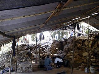 Archaeologists and restorers planning the next step in the careful excavation in Temple XIX.