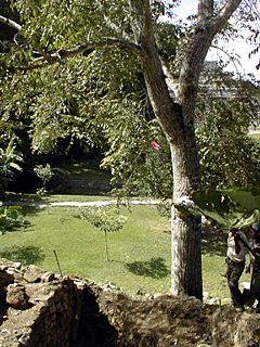 Some of our excavation at Temple XIV can be seen in the foreground of this photograph. Temple XIV is adjacent to the Temple of the Sun. The Temple of the Inscriptions is visible through the trees.