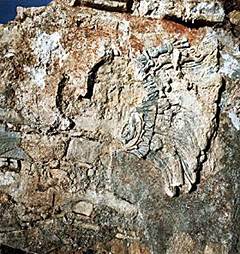 Pier J (left photograph above) depicts the remains of a long-snouted creature with lashed eyes, wearing an unusual helmet-type headdress (right photograph above) and holding a long serpent staff or spear. This animal creature appears to be the same animal as in Kan-Xul's name glyph on the Palace Tablet. [PARI editor's note: Kan-Xul is now referred to as K'inich K'an Joy Chitam.] The animal with lashed eyes in the headdress has a peculiarly shaped snout with a long knife-like section placed vertically at its end. The snout of this animal is just like that depicted for Kan-Xul I as the southwest figure on the sarcophagus in the Temple of the Inscriptions tomb. This portrait on House A-D would be Kan-Xul II, who would have been king at the time this building was constructed. The animal has the muzzle of a peccary. The mouth glyph Xul is represented by a rodent-like head much resembling the one Schele (1976a) identified as a rabbit. Ausencio Cruz Guzman says that, in Chol, xul is "any special animal." The knife is pointed at both ends and rises to a sharp ridge all along the center line. The brow, or supraorbital plate, curving over the eyelashes, has three sets of double lines with holes punched at the ends carved across the curved area. The helmet is outlined by a long vertical band, which curves back toward the ear and ends in a scroll near the front of the helmet. Another similar band runs vertically along the front of the cap, ending in an outward curve. All along the inner edge of this curving band are scrolls with six or seven holes in them. The long-lashed god, his helmet, scrolls, cheek, nose, lashes, and supraorbital plate, as well as the ridged knife and the top of the creature's snout are all painted blue.