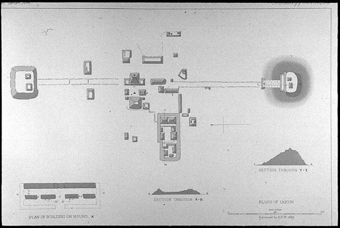 RUINS OF IXKUN [a] PLAN OF BUILDING ON MOUND. [b] SECTION THROUGH A - B. [c] SECTION THROUGH Y - Z.