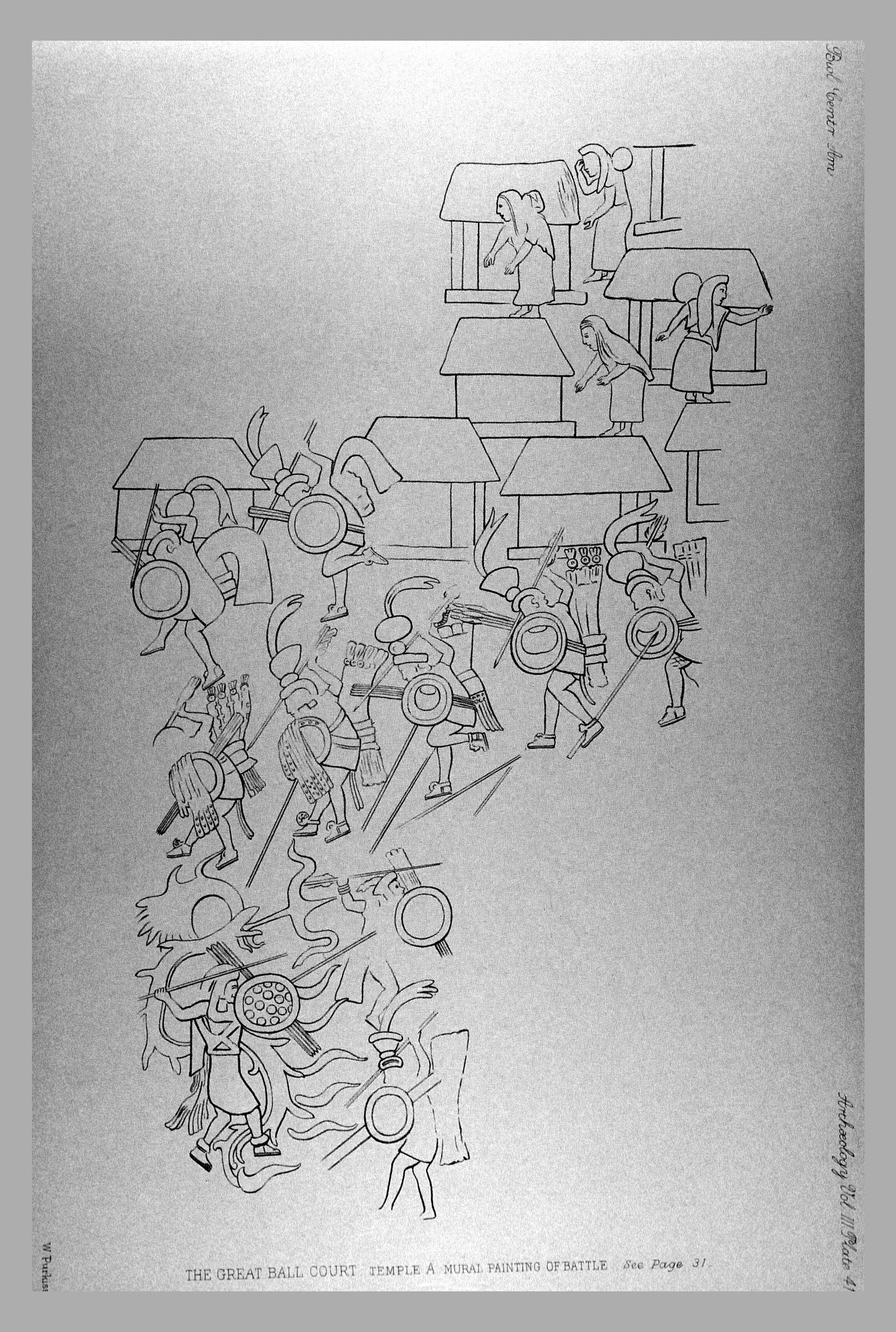 THE GREAT BALL COURT. TEMPLE A. MURAL PAINTING OF BATTLE.
